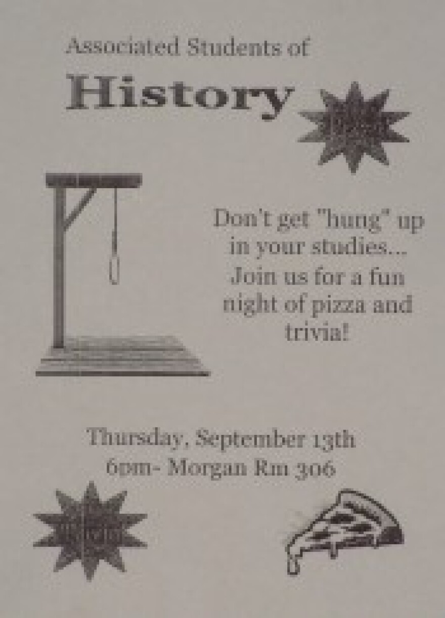 The flyer was designed for the Associated Students of History - or ASH. The flyer (left) features the words "pizza" and "trivia" along with a drawing of a cheese dripping slice of pizza. It also depicts a basic gallows with a noose hanging from the cross-piece and the phrase "Don't Get "Hung" Up In Your Studies - Join Us For A Fun Night Of Pizza and Trivia."
