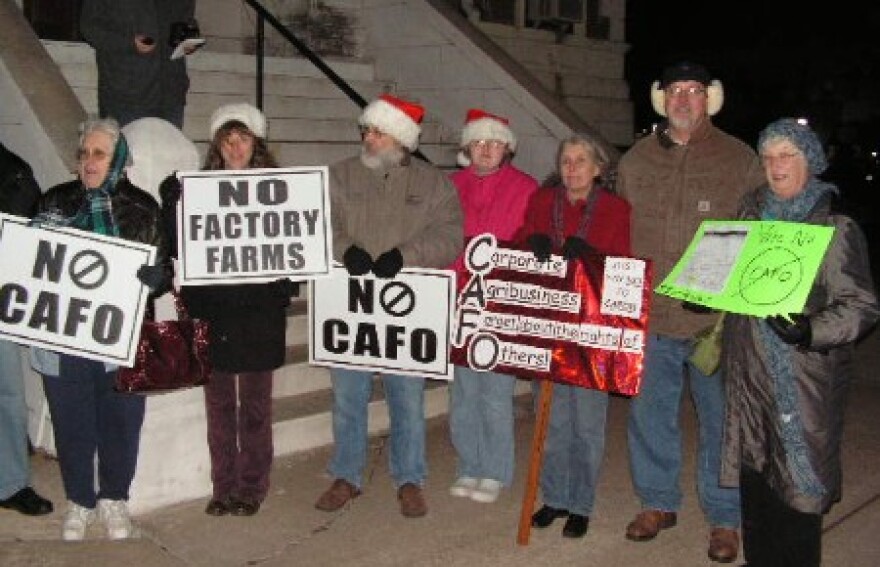 A dozen opponents of the hog farm assembled outside the county courthouse with their placards. Barbara Adams, who lives about a mile from the site, organized the demonstration. She is especially worried about water pollution.