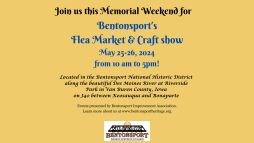 The Annual Bentonsport Flea Market and Craft Show is May 25 and 26, from 10am to 5pm. Located in beautiful Van Buren County, the Bentonsport Historic District is set next to an iron truss bridge across the Des Moines River, and accented with 1840s buildings, a large rose garden and artesian shops. Enjoy many product and food vendors while being entertained by musicians and the clip-clop of horses pulling a covered wagon. Bentonsport Historic District is between Keosauqua and Bonaparte on Highway J-40.