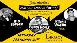 John Mueller's "Winter Dance Party" is the official live and authentic re-creation of Buddy Holly, Ritchie Valens, and the Big Bopper's final tour and the only show endorsed by the Holly, Valens, and Richardson estates. Includes over two hours of unbridled, high voltage entertainment featuring all the hit songs of the 5's era: That'll Be The Day, Peggy Sue, Oh Boy, Rave On, La Bamba, Chantilly Lace, and many more!