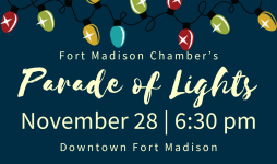 Fort Madison invites you for the 32nd Annual Parade of Lightst tonight at 6:30 pm! The parade will feature beautifully decorated floats that will illuminate Avenue G as they make their way west from 5th Street to 10th Street. The Parade of Lights will also be livestreamed right here on the Fort Madison Chamber Facebook page!
