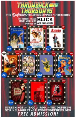 A highly anticipated Galesburg tradition, The Orpheum Theatre’s Throwback Thursdays FREE summer movie series is already underway! Screening films at least 20 years old, this year it’s back with the theme of MOVIE MUSICALS! Thanks to sponsorship from Blick Art Materials, The Throwback Thursdays 2023 Summer Movie