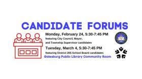 A Candidate Forum featuring Knox County candidates will begin at 6 p.m. Monday, Sept. 23 in the Community Room at the Galesburg Public Library. Doors open at 5:45 p.m.